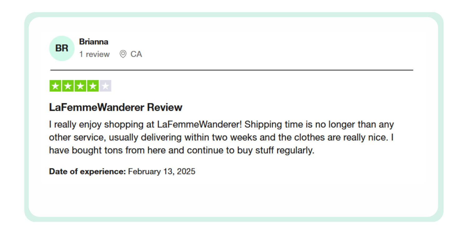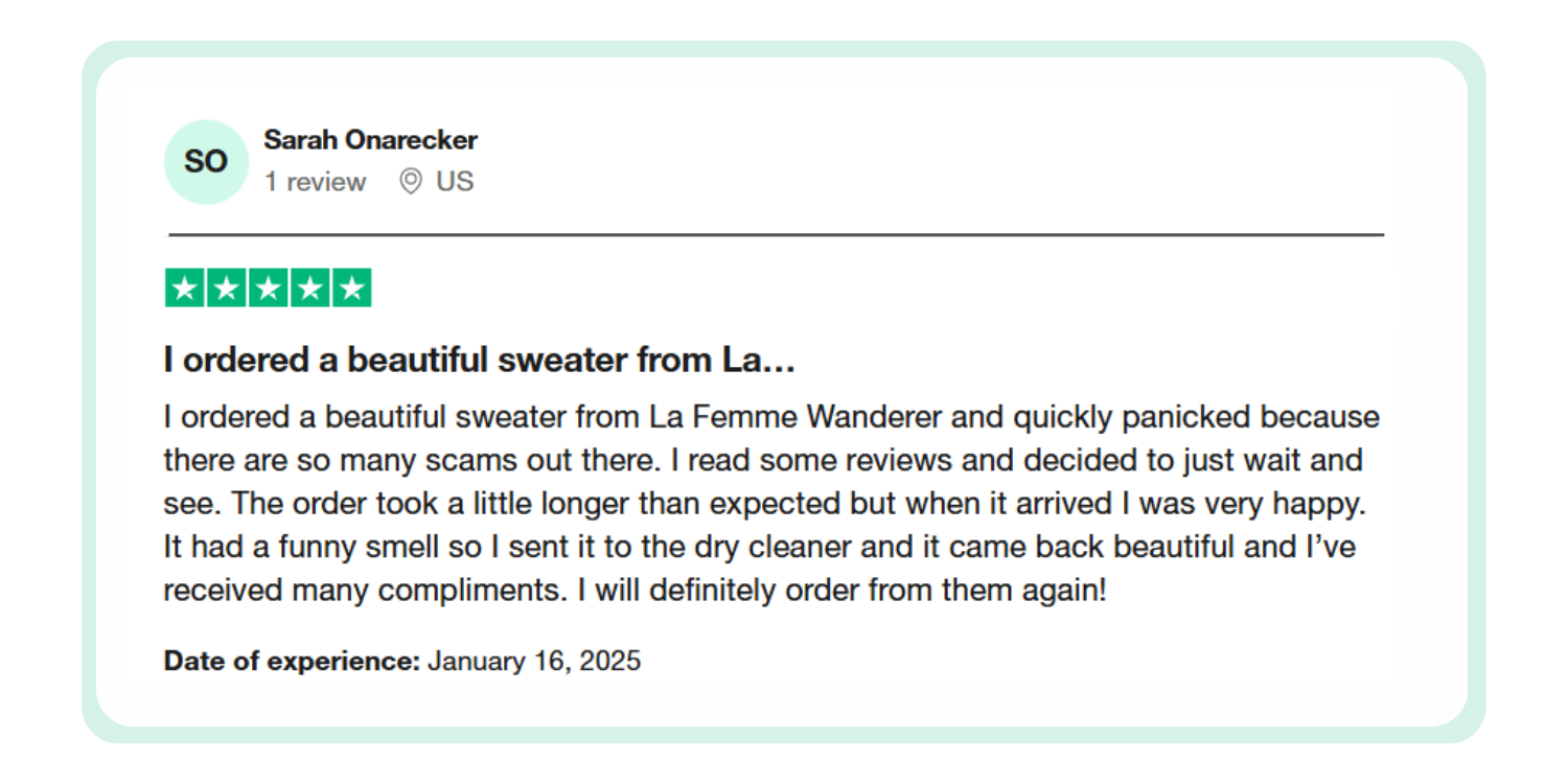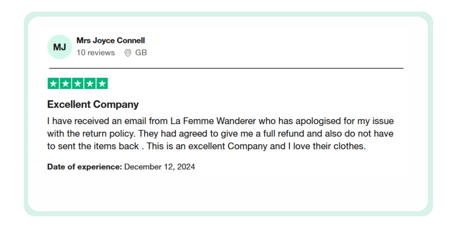 Eine vollständige Rückerstattung ist möglich. Sobald Sie Ihre Artikel erhalten haben, kontaktieren Sie uns bitte unter info@lafemmewanderer.com für Rückgabe-/Rückerstattungszwecke. Bitte beachten Sie Rückgaberecht.