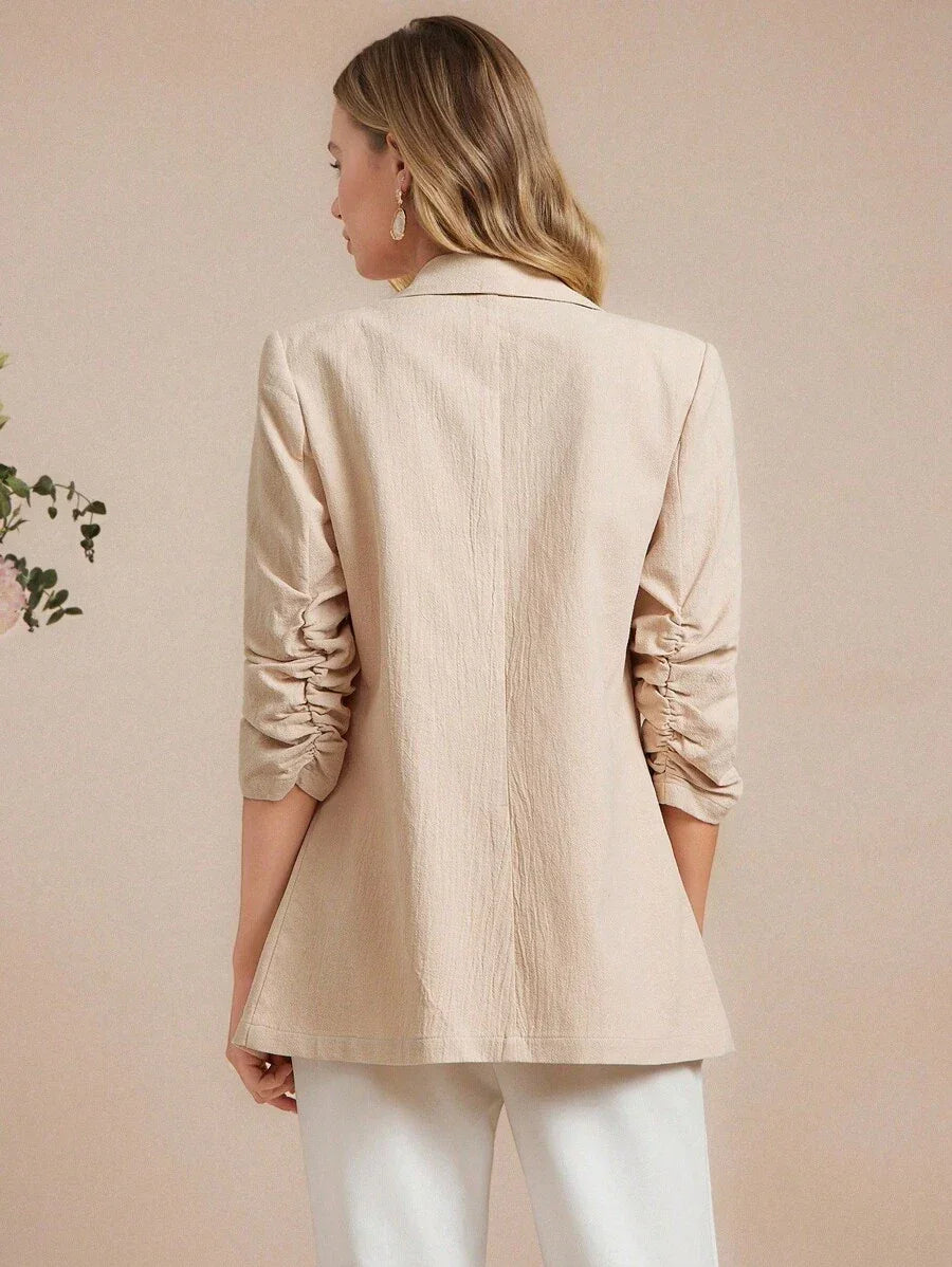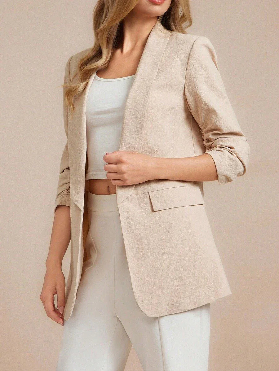 A timeless shawl collar blazer in crisp white. Unlined for a light, versatile layer that pairs with everything. Three-quarter sleeves offer a modern silhouette. Subtle ruching adds texture without complicating the clean line. A single-button placket keeps the look sleek while fake pockets preserve the streamlined shape. This piece embodies old money style with minimalist charm, perfect for timeless elegance, quiet luxury, and minimalist fashion.