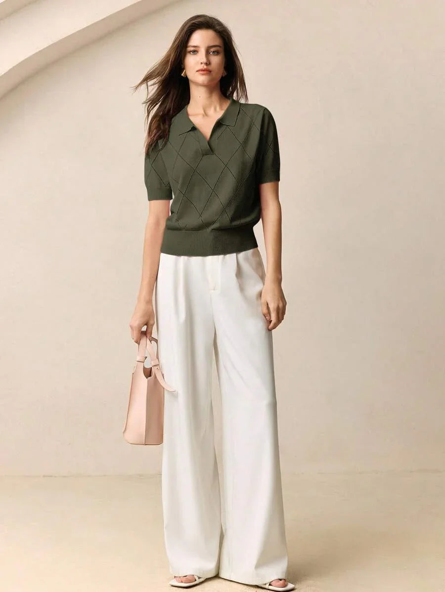 Polokragen mit Rautenmuster, kurzärmeliger Pullover, weich, lässig